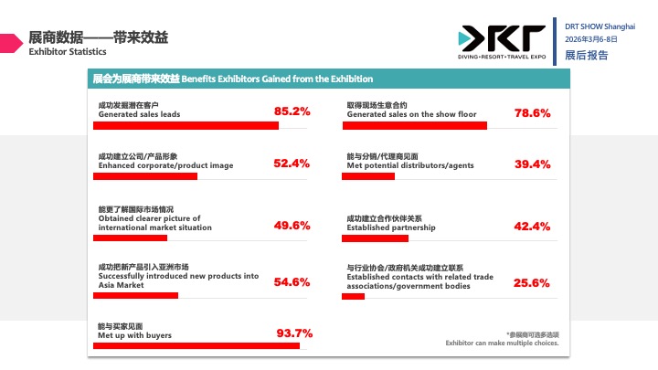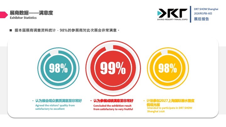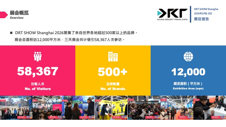 为期三天的 2026 DRT SHOW 上海国际潜水暨度假观光展于上海世博展览馆 2 号馆圆满落下帷幕。本届展会以现象级的人气爆发与惊人的商业转化力,再度刷新亚洲潜水展会的最高标准。现场人流如织、洽谈气氛沸腾,有力证明了 DRT SHOW 作为亚太区旗舰平台的无敌号召力。基于现场展商一致反馈成交额创下历年新高,2027 年上海展的席位抢占战已在闭幕当刻正式开启。